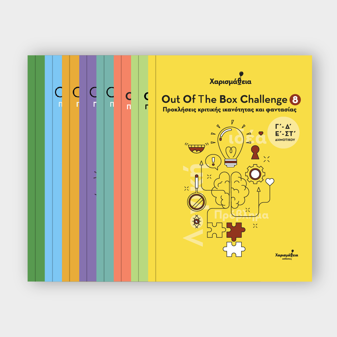Επιστράτευσε την επιμονή, τη συγκέντρωση, την κρίση και τη φαντασία σου, και ξεκίνα αυτό το συναρπαστικό ταξίδι! Στα βιβλία αυτά θα βρεις τα θέματα του Out of the Box Challenge, του πρώτου μαθητικού διαγωνισμού δημιουργικότητας και κριτικής ικανότητας για παιδιά Γ΄ και Δ΄ Δημοτικού και για παιδιά Ε΄ και ΣΤ΄ Δημοτικού, χωρισμένα ανά ηλικιακή κατηγορία.
